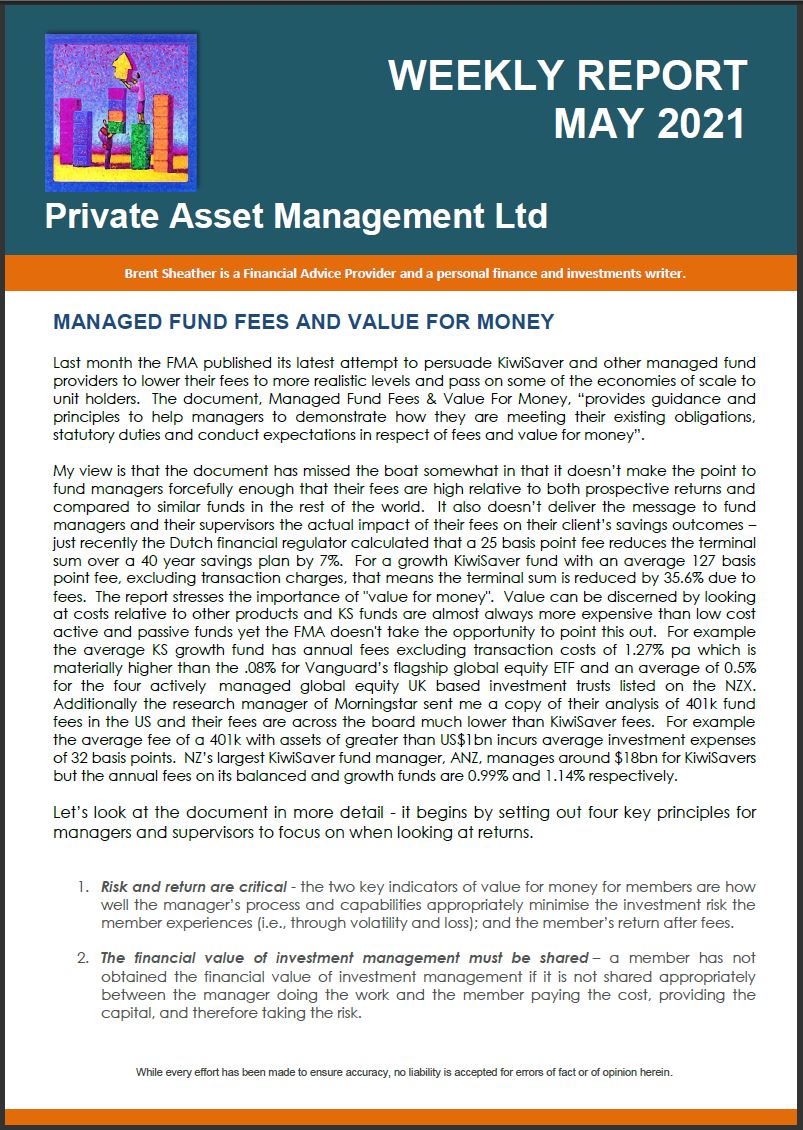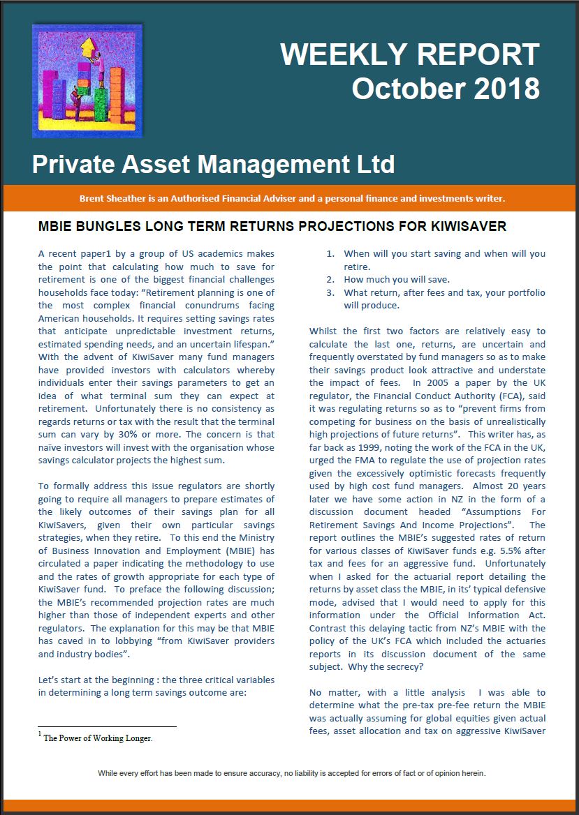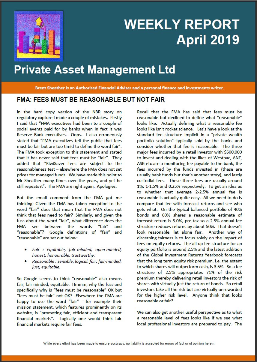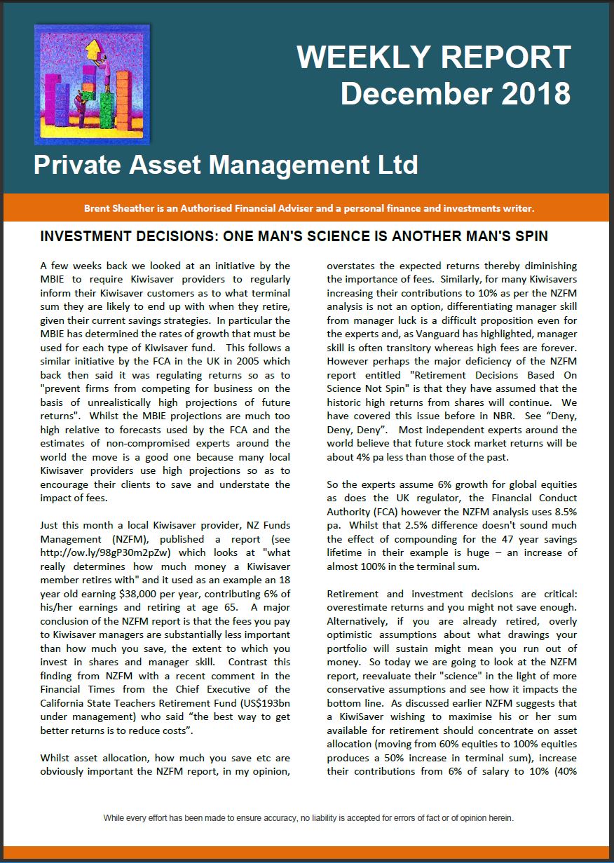 Too sarcastic maybe, however it is easy to be critical about fund manager’s choice of return forecasts. Formal intervention from the regulator looks inevitable especially given, as the FMA recently noted, the extent of the information asymmetry between product providers and consumers. The significance of overstating returns is not just academic. It can lead to bad decisions and bad outcomes in the real world. If you expect your investment to return 8% pa and it returns just 4% you may not have saved enough for your retirement. In the AQR analysis which we looked at in the first installment of this Kiwisaver series the authors made the point that future returns are likely to be lower than historic. The Economist Magazine reviewed the AQR report and noted that one of the reasons why individuals saving for retirement may not save enough is that they “may have been deceived by the robustness of past returns”. The major culprit in that deception is of course fund salespeople. The AQR analysis suggests that a 1% reduction in portfolio returns (from 5.5% to 4.5% real) requires 3% in additional savings per year to achieve the same nest-egg value. That’s huge. The additional significance of this figure is that if you are paying 1% more in fees than you need to you may be required to contribute 3% more in savings to achieve the same retirement outcome. The full AQR analysis is available at: https://www.aqr.com/~/media/files/papers/how-much-should-dc-savers-worry-about-expected-returns.pdf.