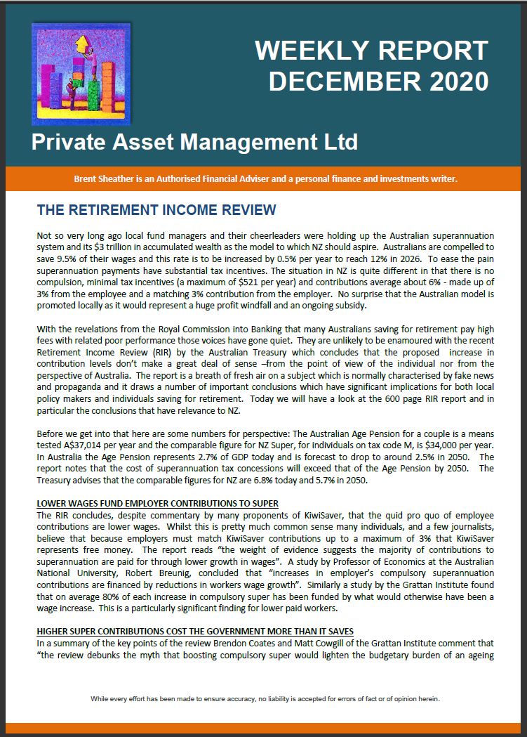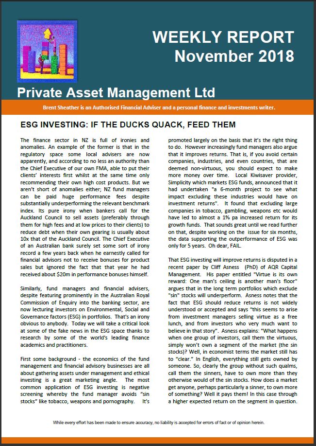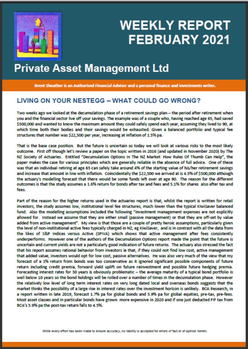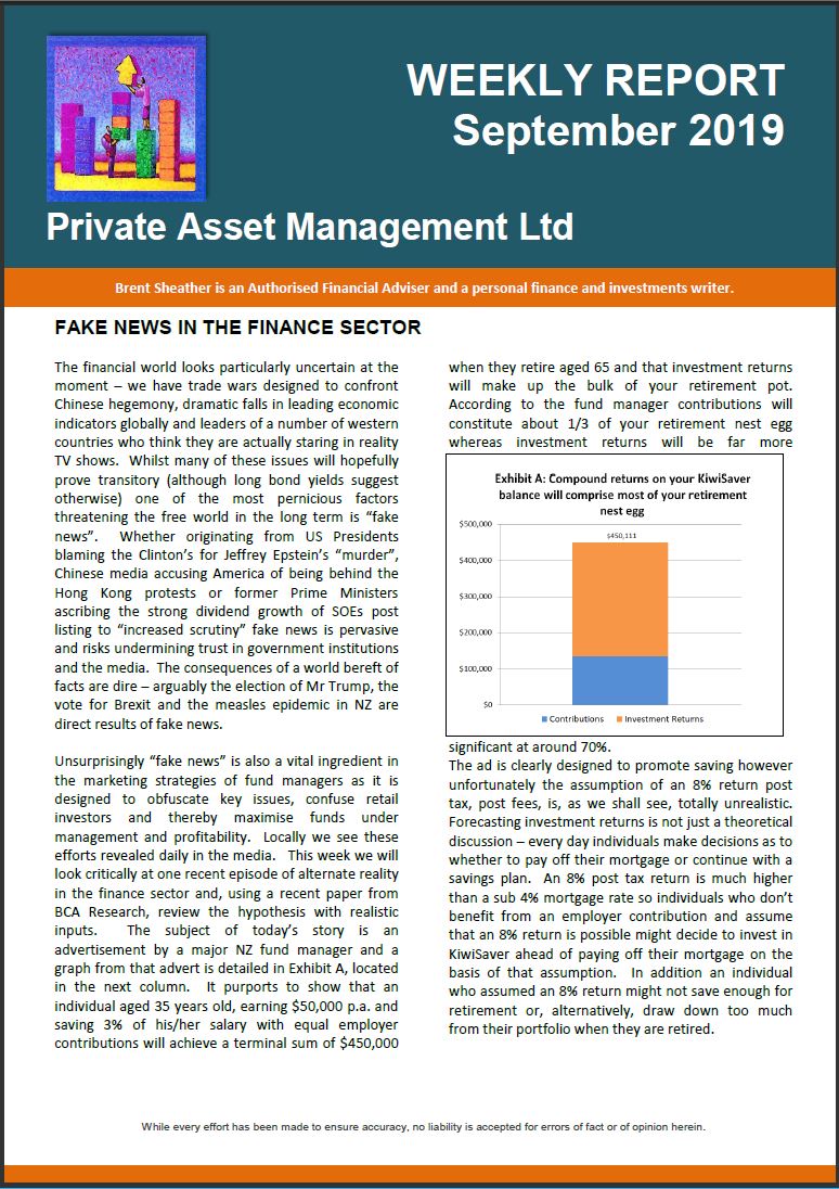 Too sarcastic maybe, however it is easy to be critical about fund manager’s choice of return forecasts. Formal intervention from the regulator looks inevitable especially given, as the FMA recently noted, the extent of the information asymmetry between product providers and consumers. The significance of overstating returns is not just academic. It can lead to bad decisions and bad outcomes in the real world. If you expect your investment to return 8% pa and it returns just 4% you may not have saved enough for your retirement. In the AQR analysis which we looked at in the first installment of this Kiwisaver series the authors made the point that future returns are likely to be lower than historic. The Economist Magazine reviewed the AQR report and noted that one of the reasons why individuals saving for retirement may not save enough is that they “may have been deceived by the robustness of past returns”. The major culprit in that deception is of course fund salespeople. The AQR analysis suggests that a 1% reduction in portfolio returns (from 5.5% to 4.5% real) requires 3% in additional savings per year to achieve the same nest-egg value. That’s huge. The additional significance of this figure is that if you are paying 1% more in fees than you need to you may be required to contribute 3% more in savings to achieve the same retirement outcome. The full AQR analysis is available at: https://www.aqr.com/~/media/files/papers/how-much-should-dc-savers-worry-about-expected-returns.pdf.
