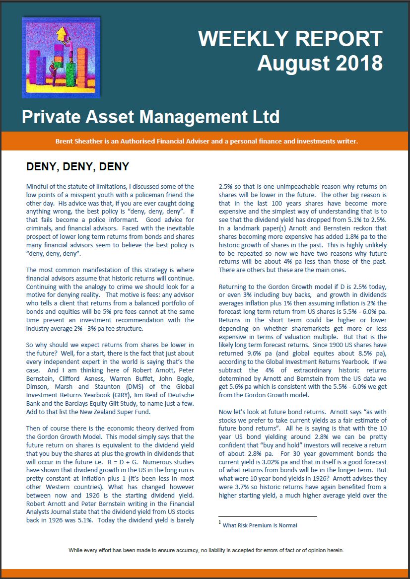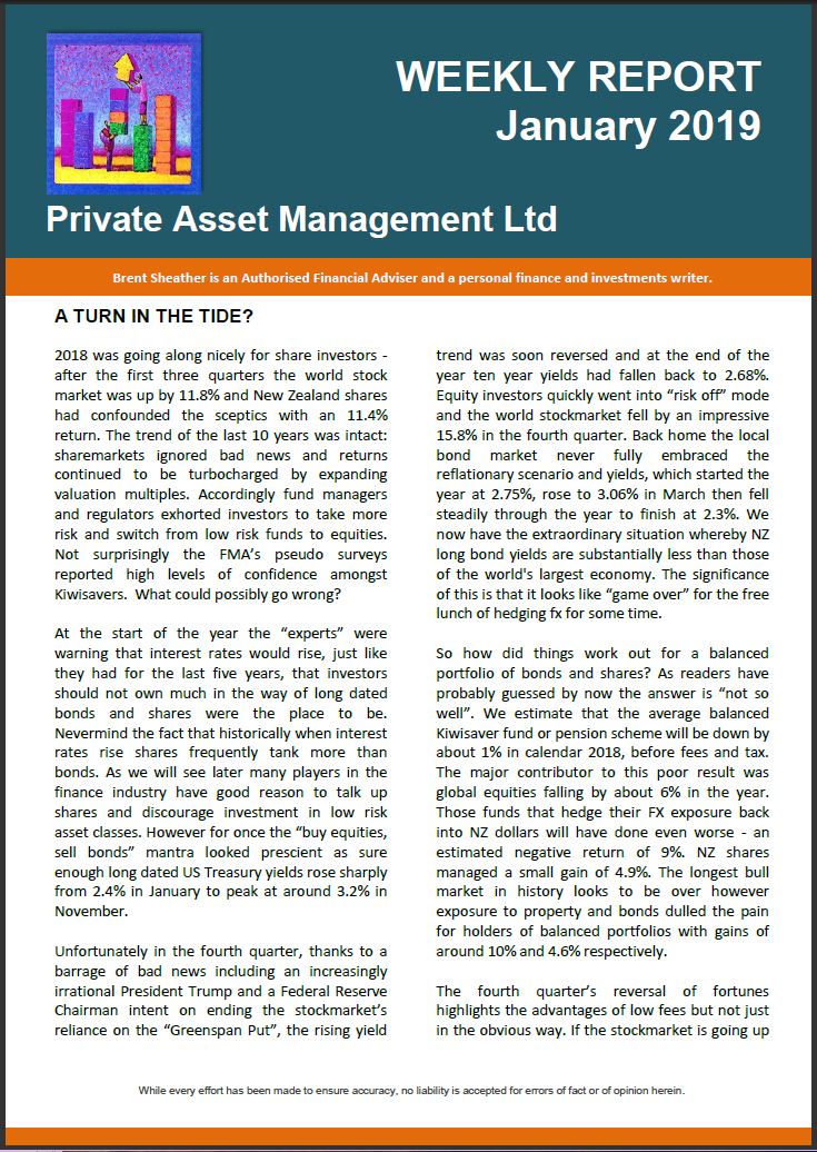 Remember however that forecasts of future returns are just that, forecasts, but paradoxically it is far easier to forecast thirty year returns than it is to forecast returns for the next twelve months. Without going into too much detail returns are a function of two variables – the normal long term return and, as John Bogle calls it, the speculative return that arises from valuation changes. In the short term the speculative return can overwhelm the normal return but over the long run valuation changes become less significant. The NZ share market in particular has enjoyed a number of years of additional speculative returns and the jury is out as to whether valuations will return to average (lower) levels or stay elevated.